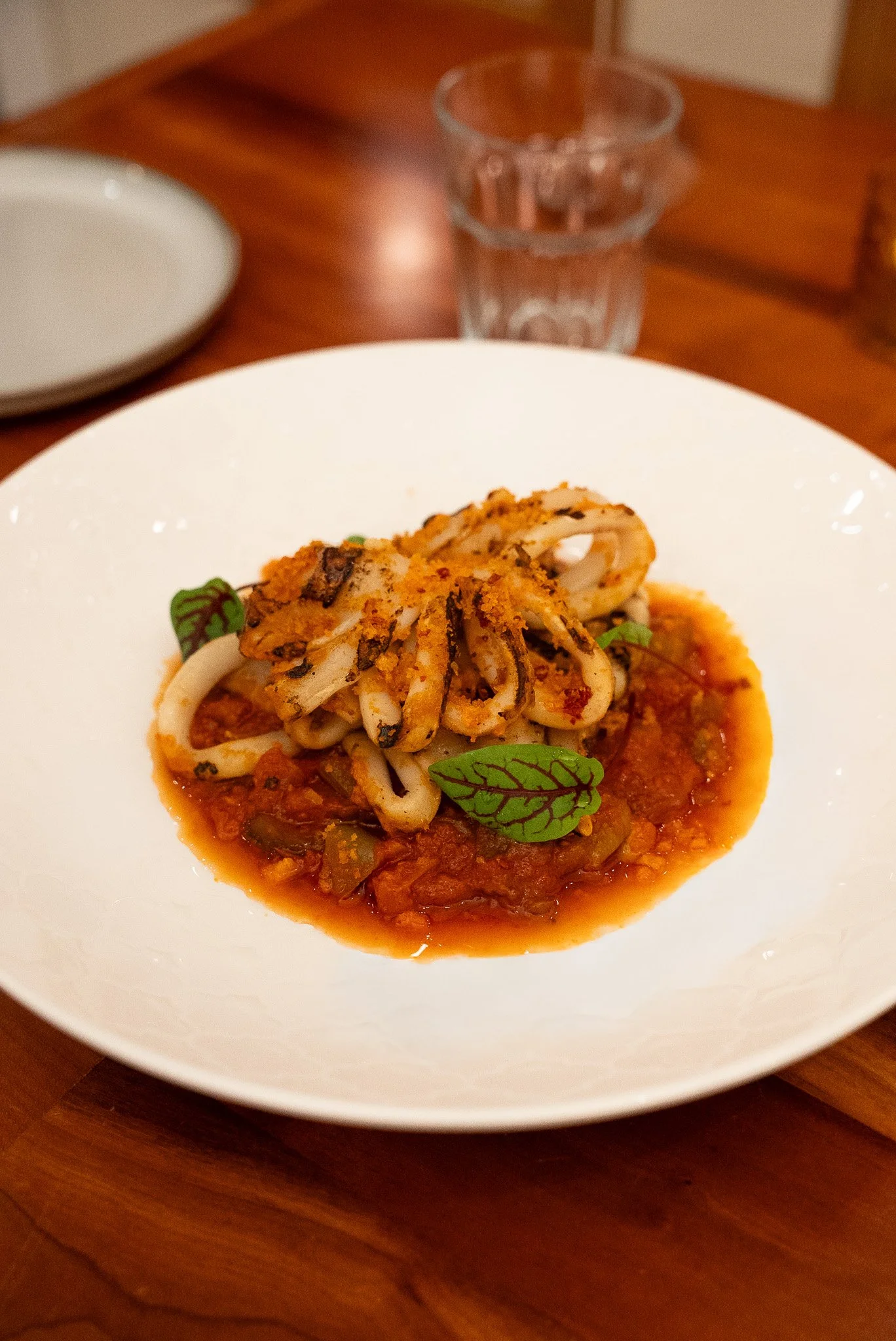 Marinated squid tubes, cherry tomato, brown Sicilian anchovies, fresh herbs, white wine.
