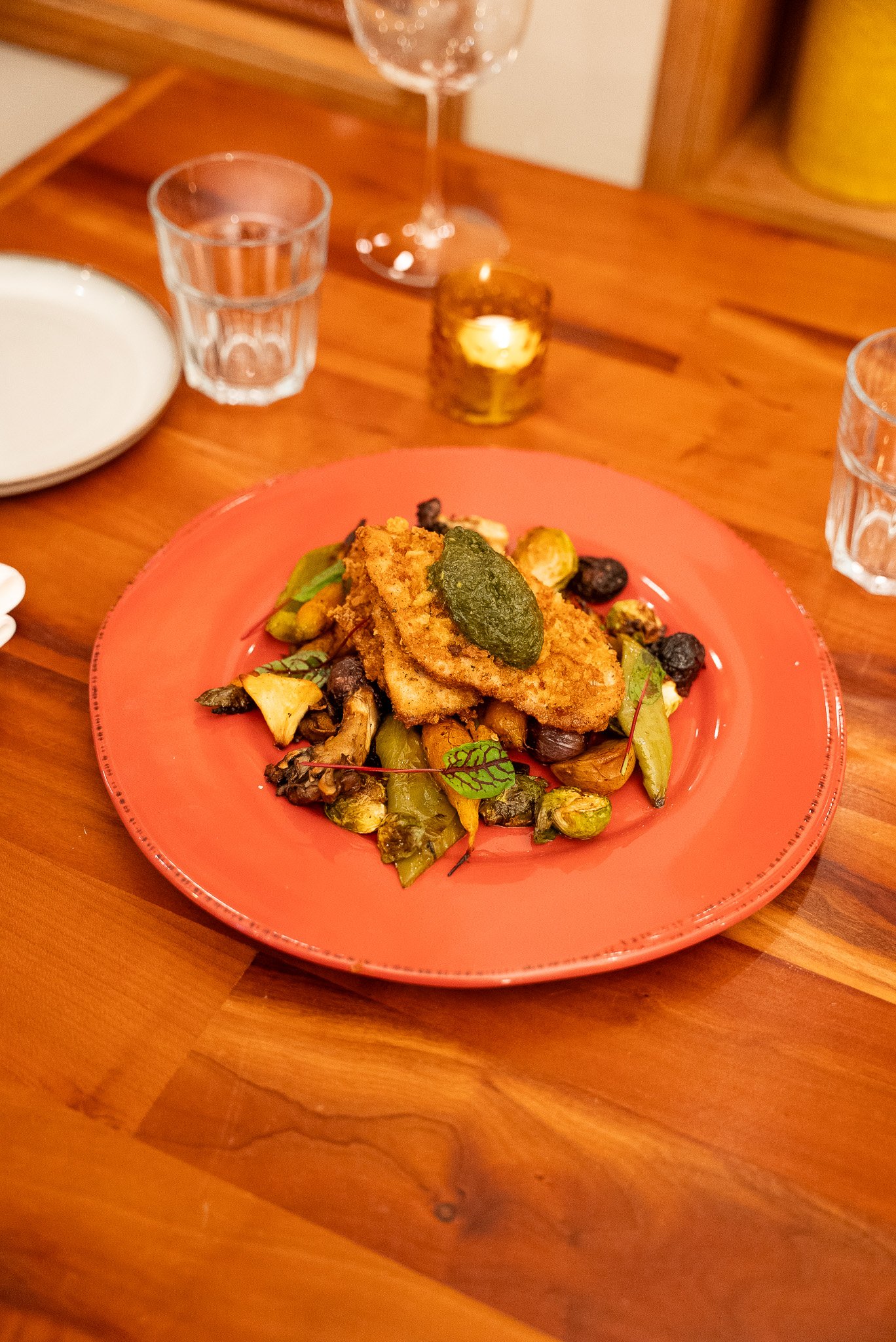 Chicken scaloppine with capers, lemon butter, and 3-acres farm vegetables.