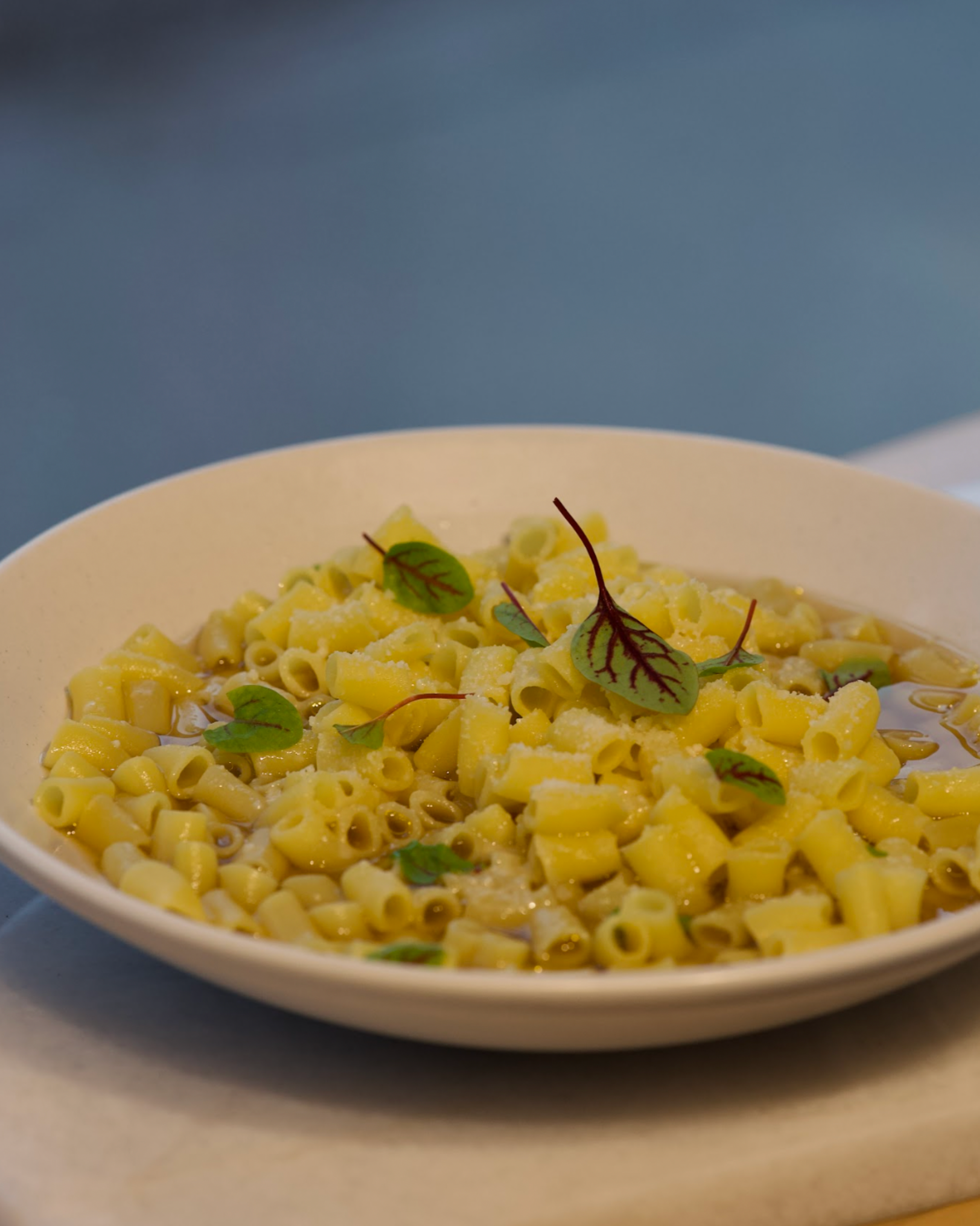 Ditalini pasta in fortified capon broth, basil oil & Grana Padano DOP