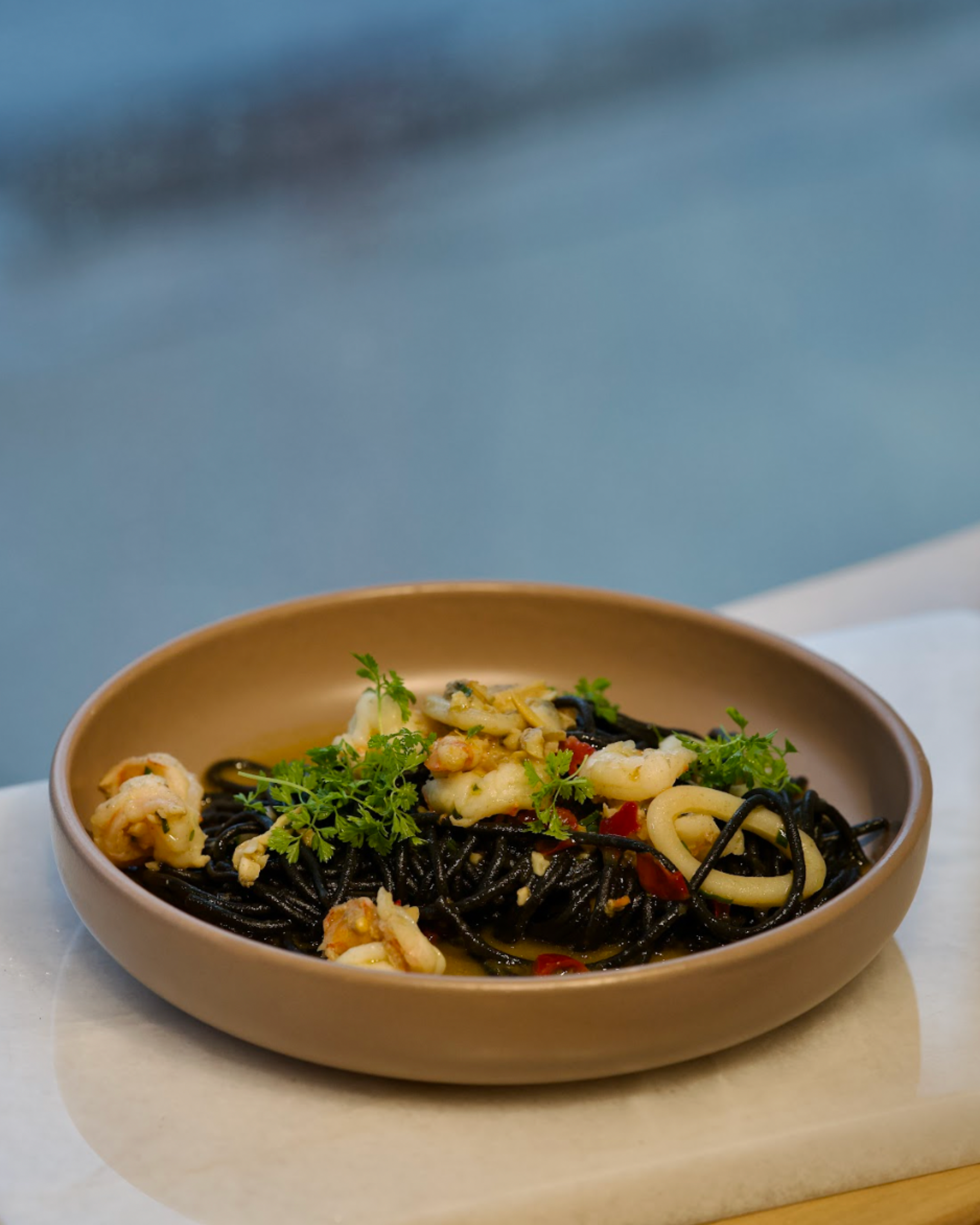 House-made squid ink spaghetti with shrimp, clams, calamari, garlic, chile, white wine & herbs